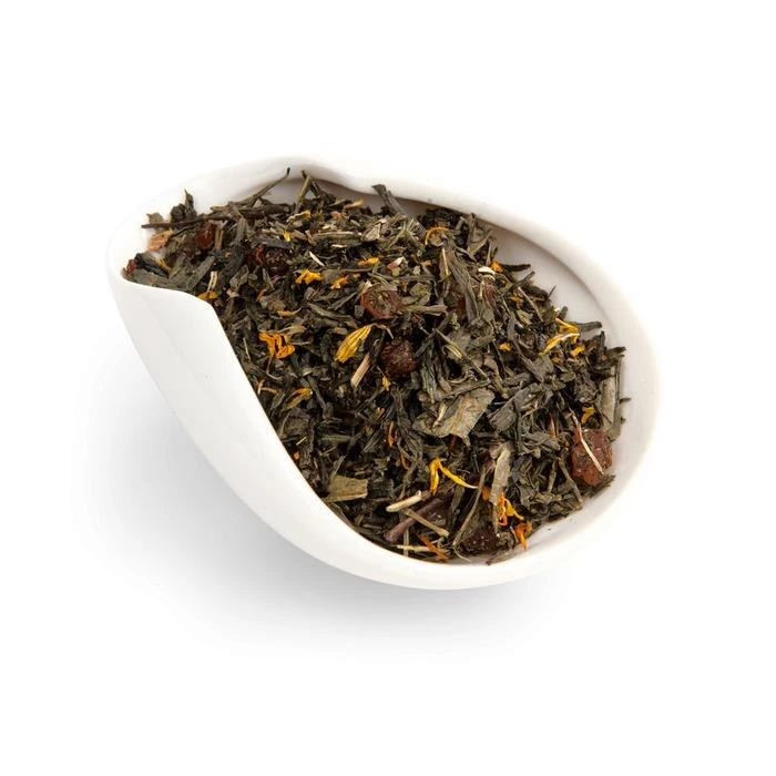 Состав: зелёный чай сенча, цукаты, лепестки календулы, ароматические масла