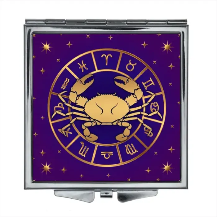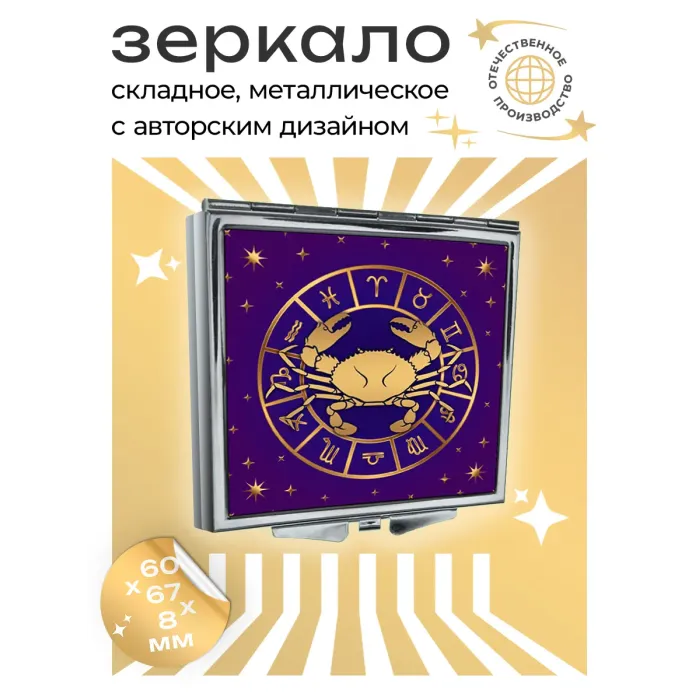 Складное зеркало квадратной формы с изображением знака зодиака Рак. Изготовлено из металла и стекла.