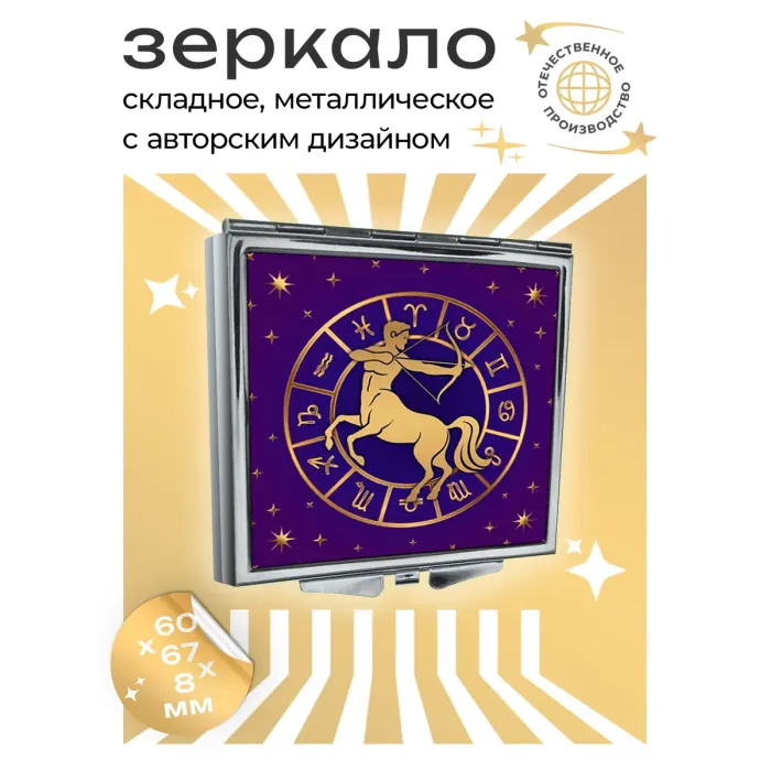 Складное зеркало квадратной формы с изображением знака зодиака Стрелец. Изготовлено из металла и стекла.