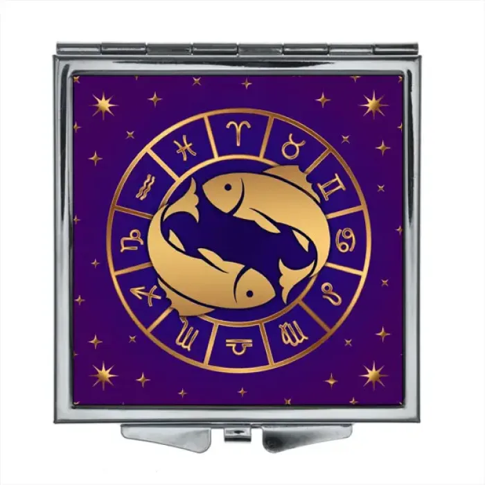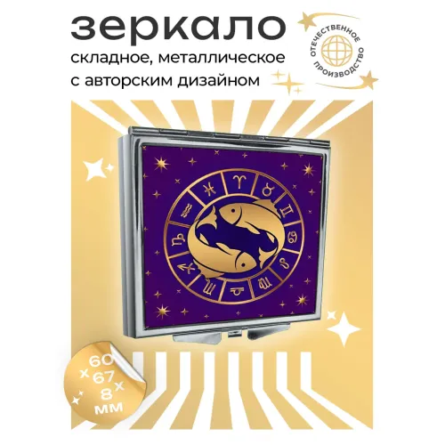 Складное зеркало квадратной формы для личного использования, выполнено из металла и стекла с полноцветной печатью изображения рыб.
