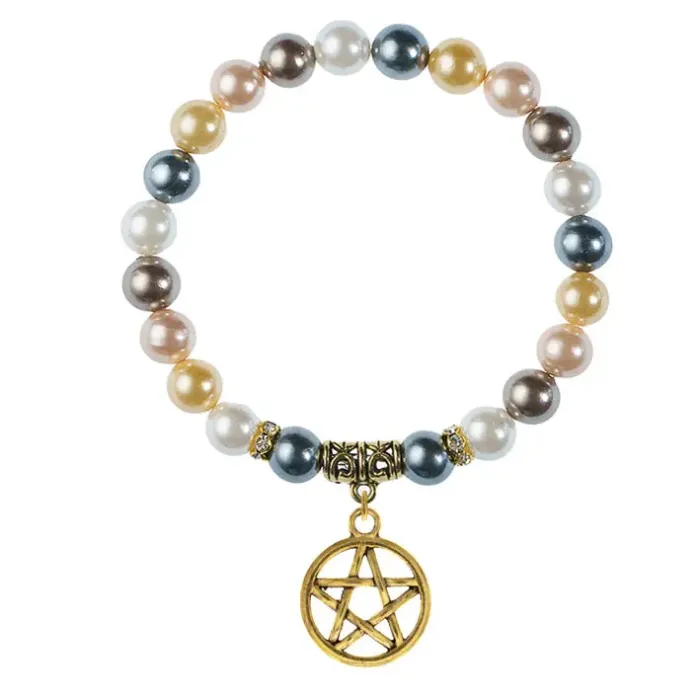 Браслет-амулет из искусственного жемчуга майорка с подвеской в виде пентаграммы.
