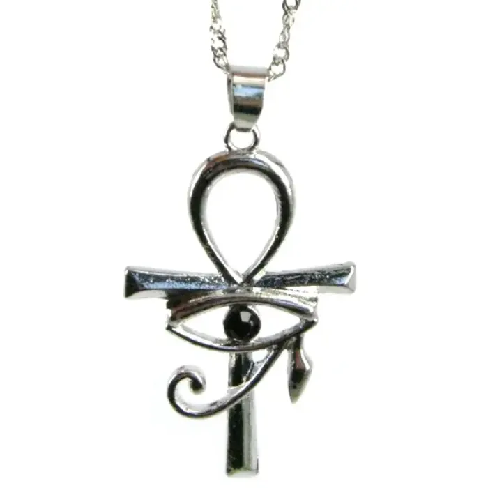 Металлический амулет с изображением древнеегипетских символов Уаджет и Анх.