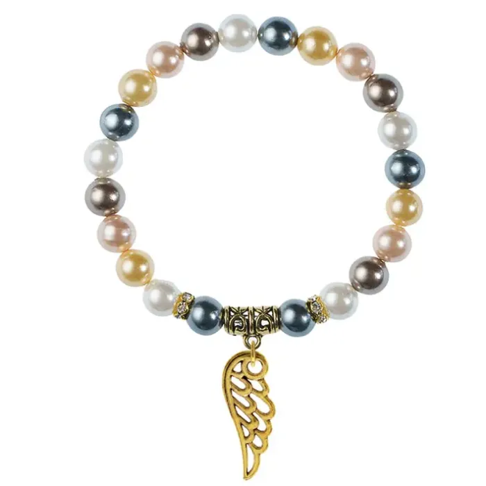 Браслет из искусственного жемчуга майорка с подвеской в виде крыла ангела.