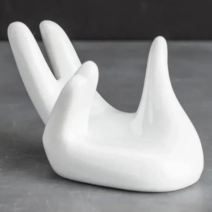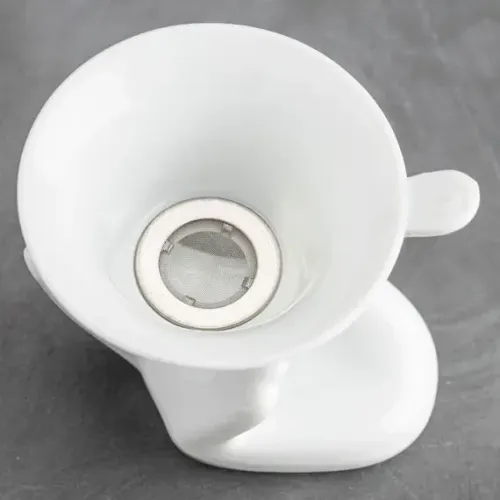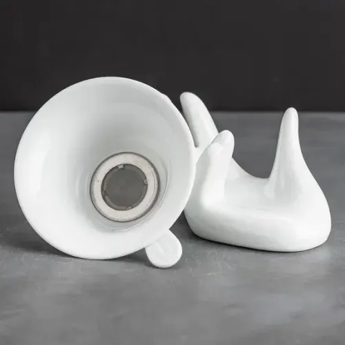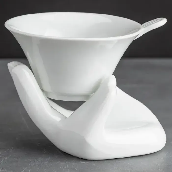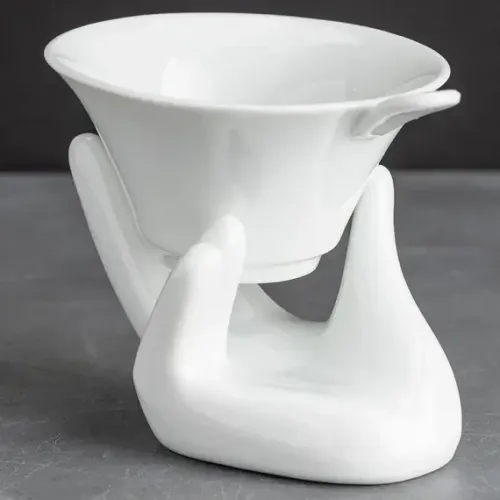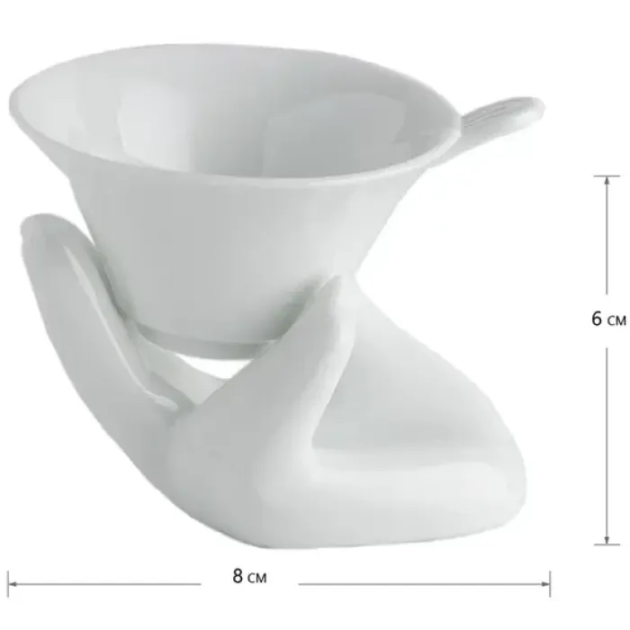 - Материал: белый фарфор- Форма ситечка: коническая- Конструкция подставки: в виде руки- Назначение: заваривание чая