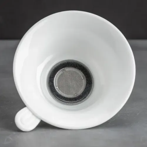 Сито для чая Гармония с подставкой предназначено для заваривания чайных листьев. Аксессуар выполнен из белого фарфора, а его конструкция включает подставку оригинальной формы.