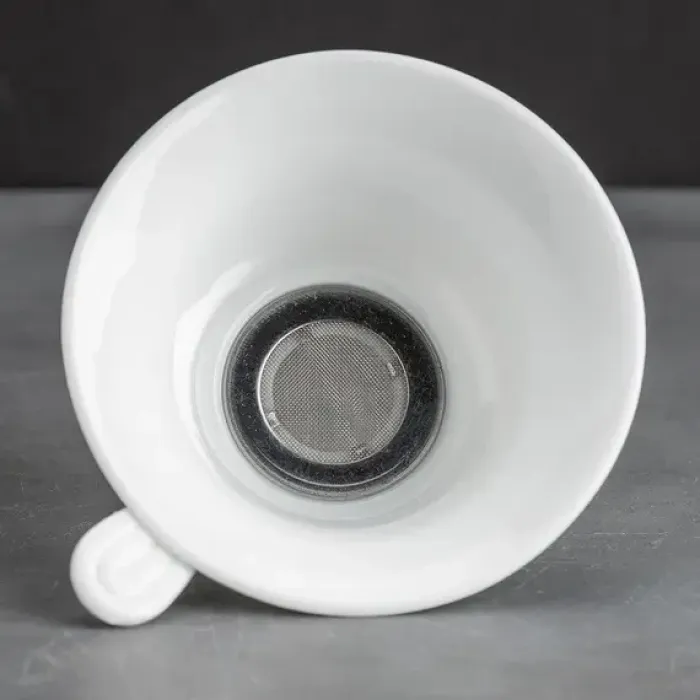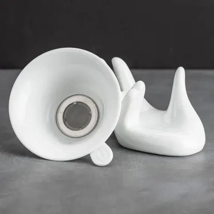 Изделие изготовлено из фарфора, материала, известного своей прочностью и долговечностью. Ситечко имеет коническую форму, которая способствует полному раскрытию чайных листьев. Подставка выполнена в виде руки, обеспечивая устойчивость всей конструкции во время использования.