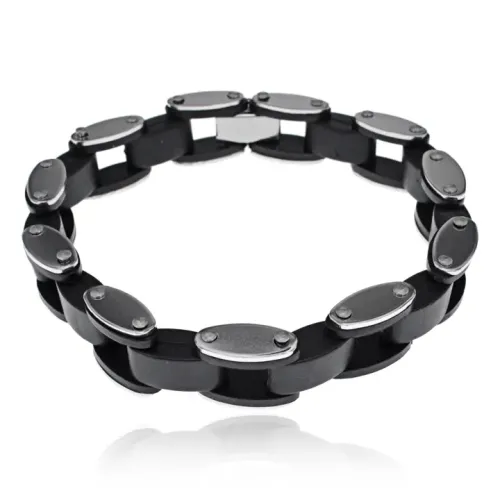 Мужской браслет из металла с черными вставками и коробчатым замком.