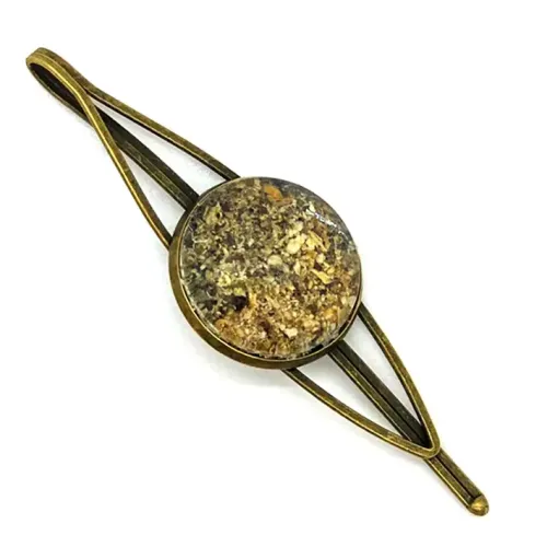 Обережная заколка для волос из девясила, металла и стекла с символикой защиты.