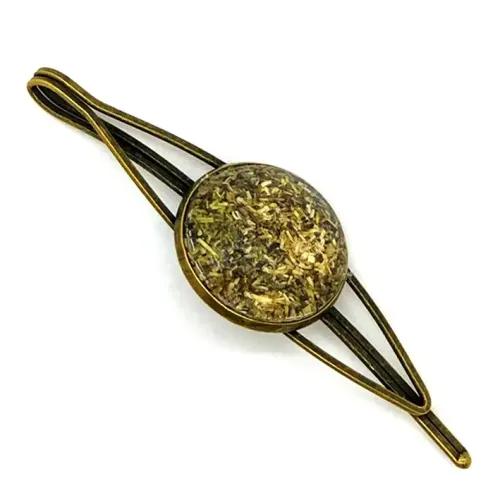 Заколка обережная с символикой ромашки, выполненная из металла и стекла.