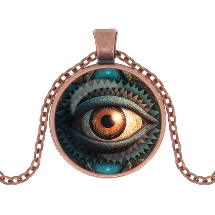 Кулон с цепочкой Око — это стильный амулет, который сочетает в себе красоту и символику. Изготовленный из бижутерного сплава с медным покрытием, он привлекает внимание благодаря изображению под выпуклой стеклянной линзой, создающей эффект глубины. Основные особенности включают: