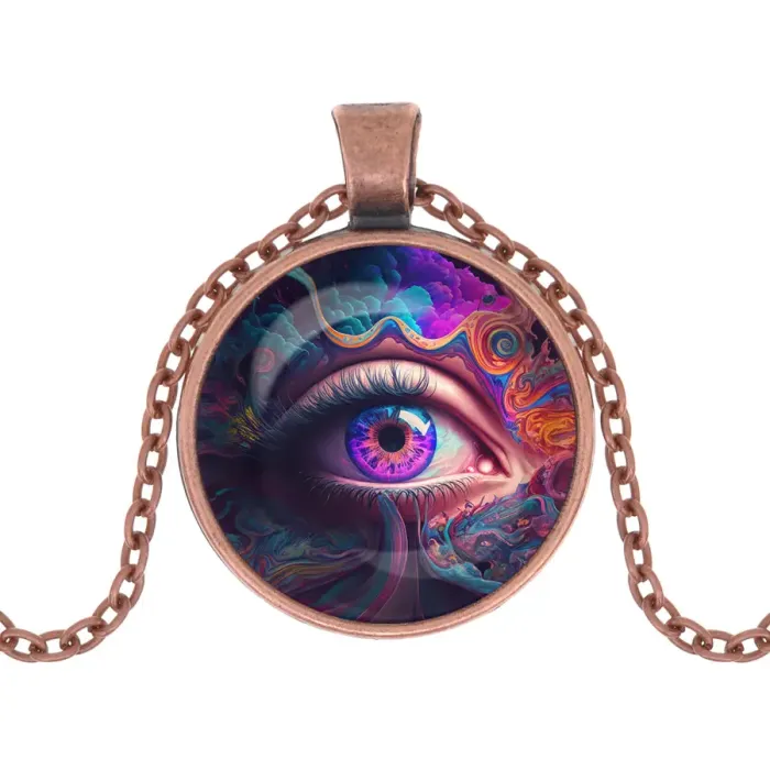 Кулон с цепочкой Глаз — это стильный амулет, который сочетает в себе красоту и символику. Изготовленный из бижутерного сплава с медным покрытием, он привлекает внимание благодаря изображению под выпуклой стеклянной линзой, создавая эффект глубины. Основные особенности:
