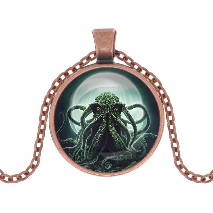 Кулон с изображением Ктулху — это стильный амулет, выполненный из бижутерного сплава с медным покрытием. Изображение под выпуклой стеклянной линзой создает эффектный визуальный акцент, который привлечет внимание и станет оригинальным дополнением к любому образу. В комплект входит цепочка с замком, что позволяет сразу носить кулон. Упаковка в прозрачный полипропиленовый пакетик делает этот аксессуар идеальным для подарка или личного использования. Культовый символ Ктулху имеет глубокий мистический смысл и является популярным элементом в современном искусстве и моде.