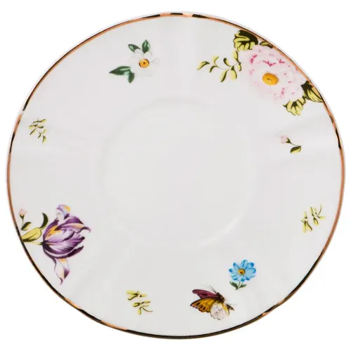 Изделие выполнено из фарфора, что обеспечивает прочность и долговечность. Поверхность украшена цветочной деколью с золотой отделкой. Форма чашки и блюдца рассчитана на удобное использование.