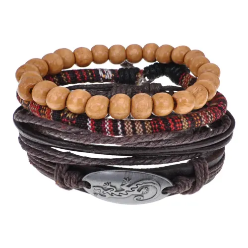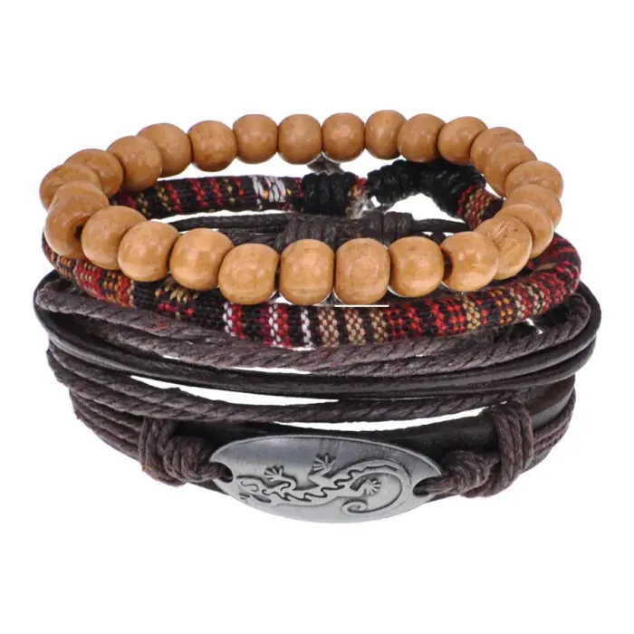 Набор из четырёх браслетов-сувениров, выполненных из натуральной кожи, дерева и металла с серебристым покрытием.