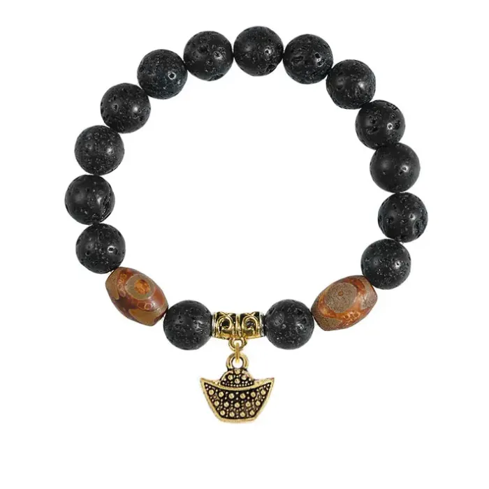 Браслет-амулет из натурального камня лава с подвеской в виде золотого слитка и бусинами Дзи.