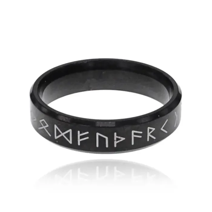 Руническое кольцо из стали черного цвета с нанесенными символами.