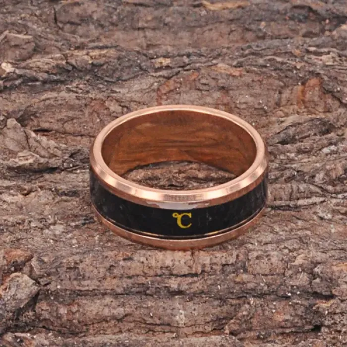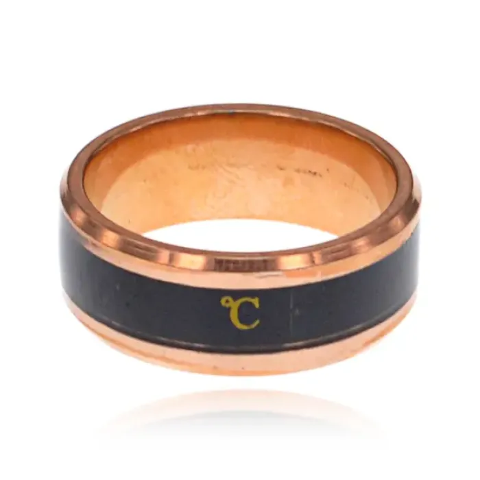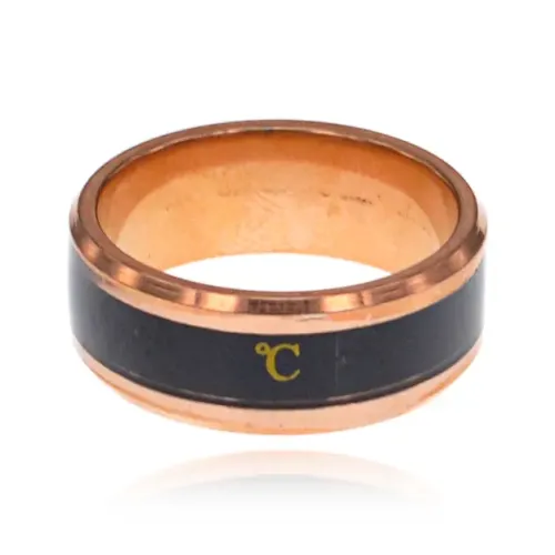 Термокольцо — украшение, показывающее температуру тела. Цвет розовое золото с черными акцентами.