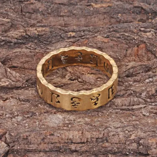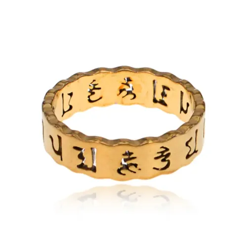 Кольцо из стали с золотым покрытием и символикой мантры. Размер 8.