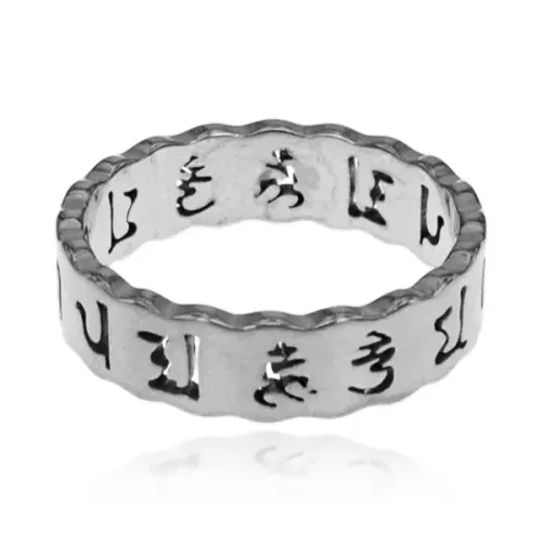 Кольцо из стали с серебряным покрытием, украшенное мантрой.