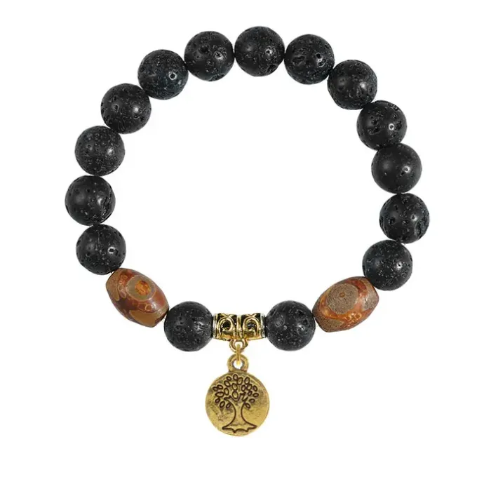 Браслет-амулет из натурального камня лава с подвеской в виде дерева жизни и бусинами Дзи.
