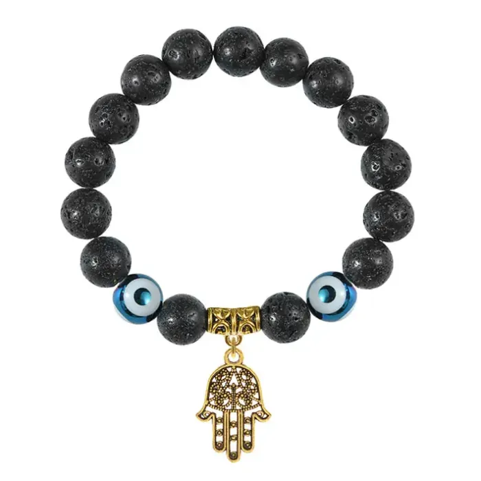 Браслет-амулет из натурального камня лава с подвеской Хамса и фарфоровыми бусинами Дзи.