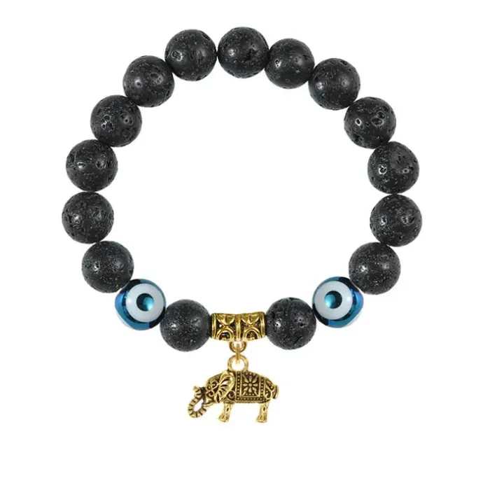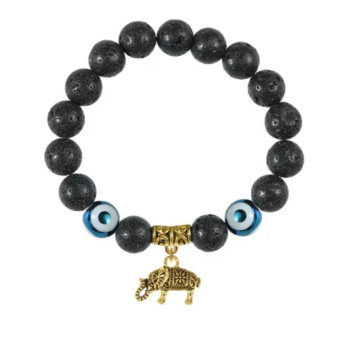 Браслет-амулет из натурального камня лава с подвеской в виде слона и бусинами Дзи.