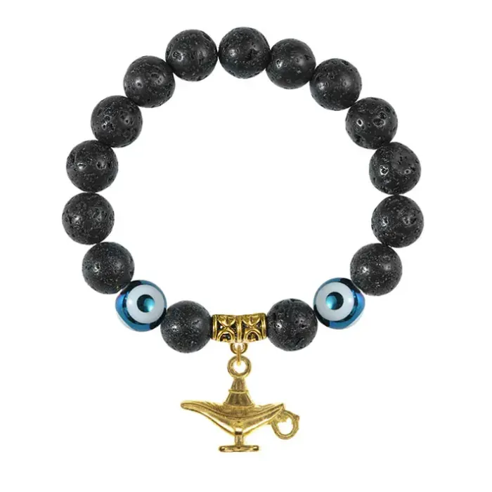 Браслет-амулет из натурального камня лава с фарфоровыми бусинами Дзи и подвеской в виде волшебной лампы.
