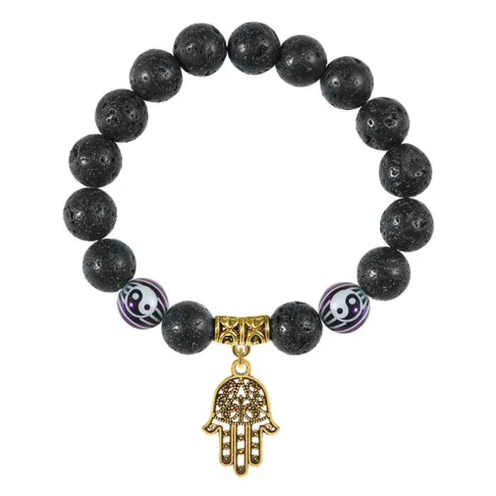 Браслет-амулет из натурального камня лава с фарфоровыми бусинами Инь-Ян и подвеской Хамса.