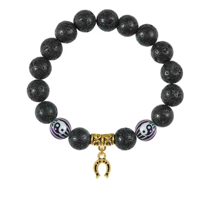 Браслет-амулет из натурального камня лава с фарфоровыми бусинами Инь-Ян и подвеской в виде подковы.