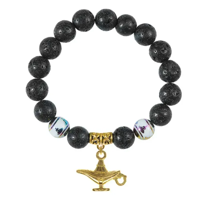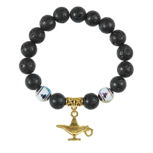 Браслет-амулет из натурального камня лава с подвеской в виде волшебной лампы и бусинами Будда.