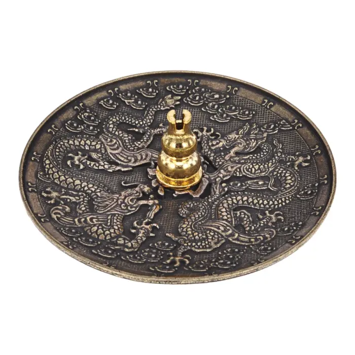 Подставка для благовоний Два Дракона — стильный аксессуар, который подчеркнёт атмосферу любого пространства и станет идеальным дополнением к ритуалам ароматерапии. Изготовленная из металла с элегантным покрытием под бронзу и золото, она привносит нотку роскоши в повседневную практику. Основные особенности: - Подходит для использования как с ароматическими палочками, так и с конусами, обеспечивая универсальность применения. - Металлический материал гарантирует долговечность и устойчивость к высоким температурам. - Эстетичное покрытие под бронзу (диаметр 8,5 см, высота 1 см) придаёт изделию винтажный шарм. - Компактная версия с золотым покрытием (размеры 2 см × 1 см × 1 см) идеально впишется в любой интерьер. Советы по использованию: Для создания гармоничной атмосферы рекомендуется использовать подставку во время медитаций или релаксации. Она также может стать отличным элементом декора на столе или полке. Подставка Два Дракона не только удобна в использовании, но и прекрасно подходит в качестве небольшого подарка для ценителей ароматов.