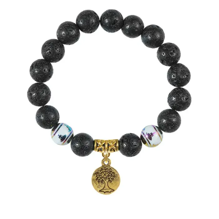 Браслет с фарфоровыми бусинами Будда и подвеской Дерево жизни (защита и развитие), лава 10мм BSPD10-04-S001