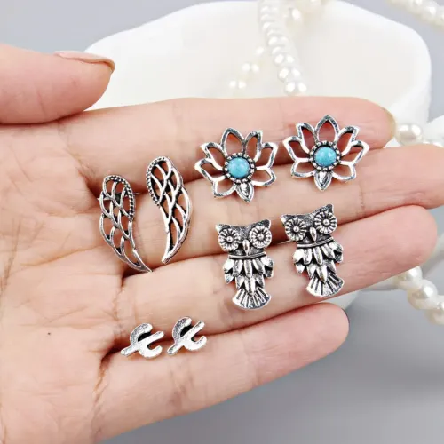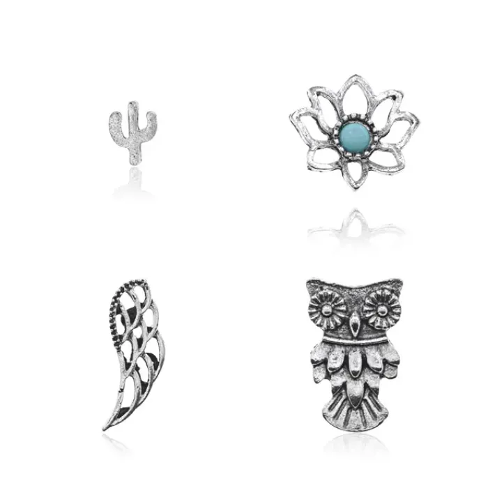 Набор из четырёх пар серёг для ношения. Материал — металл с серебристым покрытием. Тип замка — пусет (гвоздик).