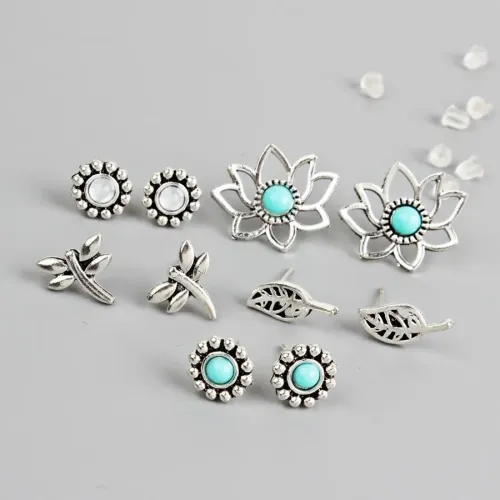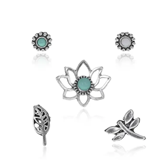 Набор из пяти пар серёг для ношения. Материал — металл с покрытием под серебро, замок типа пусет.