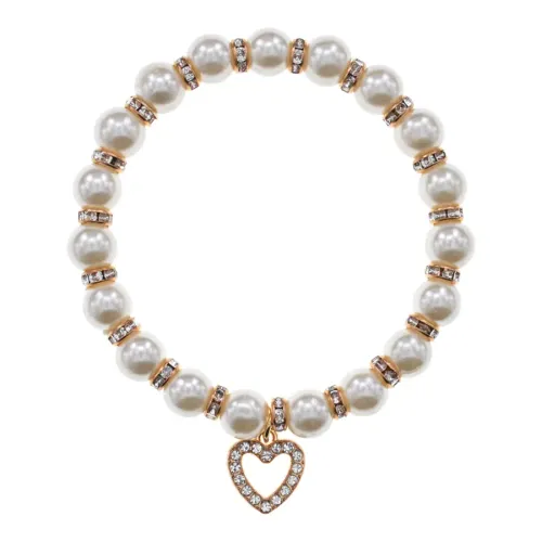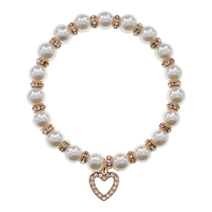 Стрейч-браслет с бусинами из искусственного жемчуга и декоративным коннектором в виде сердца.