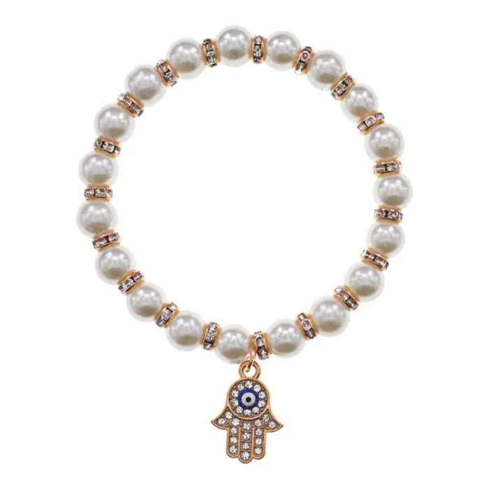 Стрейч-браслет с коннектором в виде Хамсы и бусинами из искусственного жемчуга.