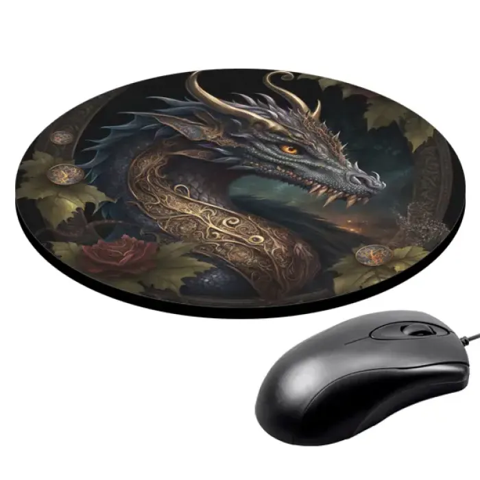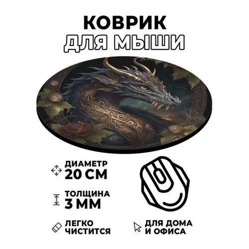 Коврик для компьютерной мыши с изображением дракона — это не только практичный аксессуар, но и стильный элемент декора рабочего пространства. Его диаметр составляет 20 см, а толщина — 3 мм, что обеспечивает комфортное использование. Изображение на коврике отличается стойкостью и четкостью, придавая ему выразительность и яркость. Благодаря качественной поверхности обеспечивается отличное скольжение мышки, что делает работу за компьютером более приятной и эффективной. Этот коврик станет оригинальным подарком или дополнением к личному стилю в офисе или дома.