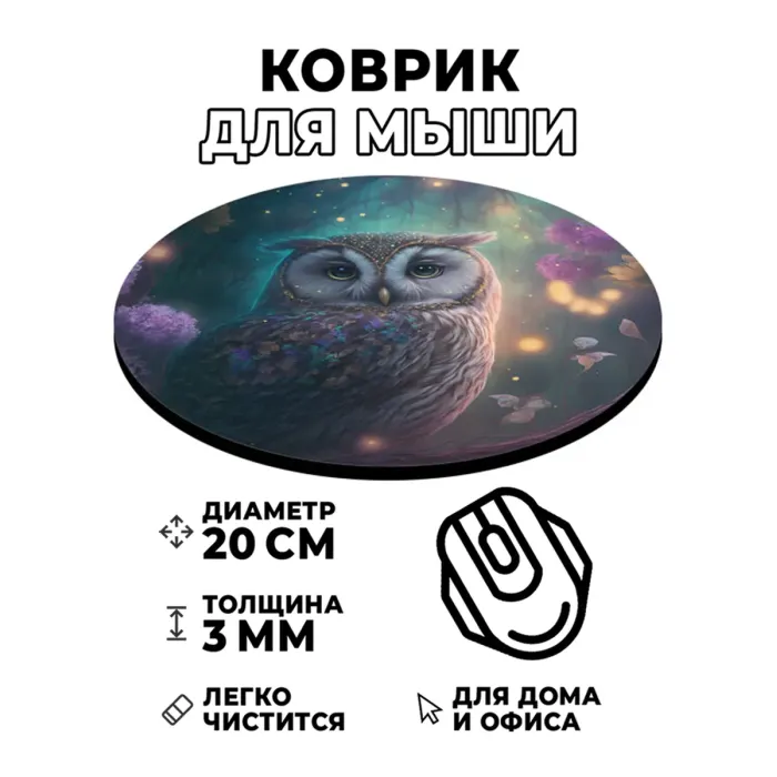 Коврик для компьютерной мыши с изображением филина — это стильный и практичный аксессуар, который добавит индивидуальности рабочему месту. Благодаря диаметру 20 см и толщине 3 мм он обеспечивает комфортное использование мыши. Изображение отличается стойкостью, четкостью и контрастностью, что делает его настоящим украшением стола. Коврик гарантирует отличное скольжение мышки, позволяя работать или играть без лишних усилий. Этот товар станет не только полезным инструментом, но и оригинальным элементом декора.