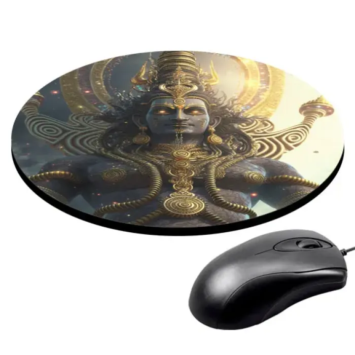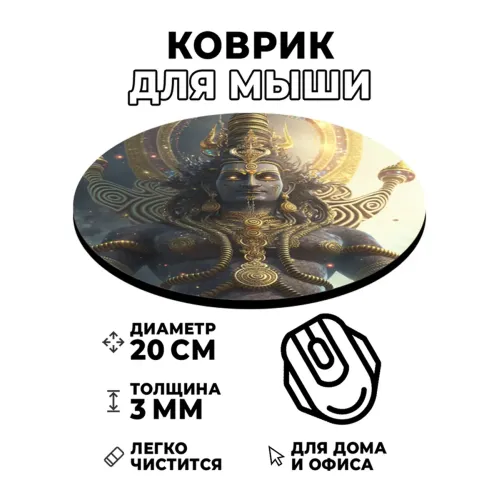 Коврик для компьютерной мыши с изображением Шивы станет стильным дополнением рабочего пространства. Он не только украшает стол, но и привносит элементы восточной культуры в повседневную жизнь. Диаметр коврика составляет 20 см, а толщина — 3 мм, что обеспечивает комфортное использование.