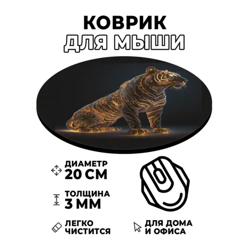 Коврик для компьютерной мыши с ярким изображением тигра станет не только практичным аксессуаром, но и стильным элементом декора рабочего места. Он обладает диаметром 20 см и толщиной 3 мм, что обеспечивает комфортное использование. Стойкое, чёткое и контрастное изображение радует глаз и вдохновляет на продуктивную работу. Коврик обеспечивает отличное скольжение мышки, что делает его идеальным выбором как для офисного использования, так и для домашнего компьютера. Этот коврик — отличный способ добавить индивидуальности в повседневные задачи.