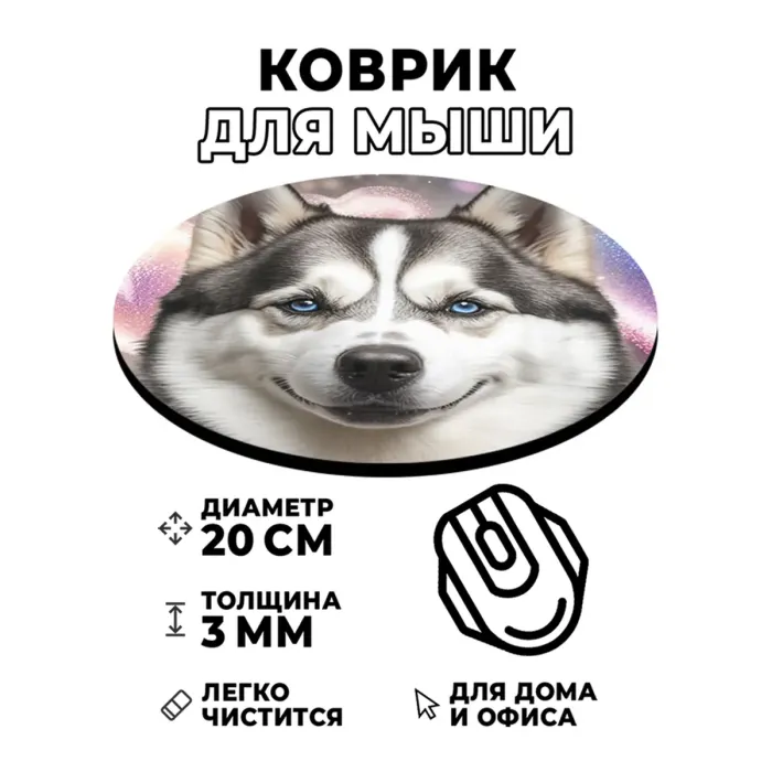 Коврик для компьютерной мыши с изображением собаки породы Хаски станет не только практичным аксессуаром, но и стильным элементом рабочего пространства. Этот коврик диаметром 20 см и толщиной 3 мм обеспечивает отличное скольжение мыши благодаря качественным материалам.