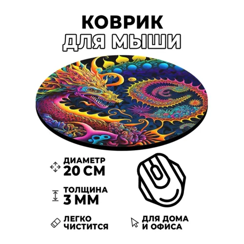 Коврик для компьютерной мышки с изображением дракона станет ярким акцентом на рабочем месте. Он не только украшает пространство, но и обеспечивает комфорт при использовании. Диаметр коврика составляет 20 см, а толщина — 3 мм, что гарантирует отличное скольжение мышки.