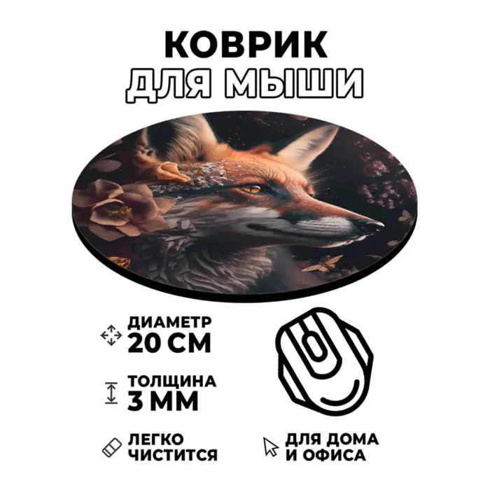 Коврик для компьютерной мыши с изображением лисы станет стильным дополнением рабочего места и добавит ярких красок в повседневные задачи. С диаметром 20 см и толщиной 3 мм, он идеально подходит для комфортного использования.
