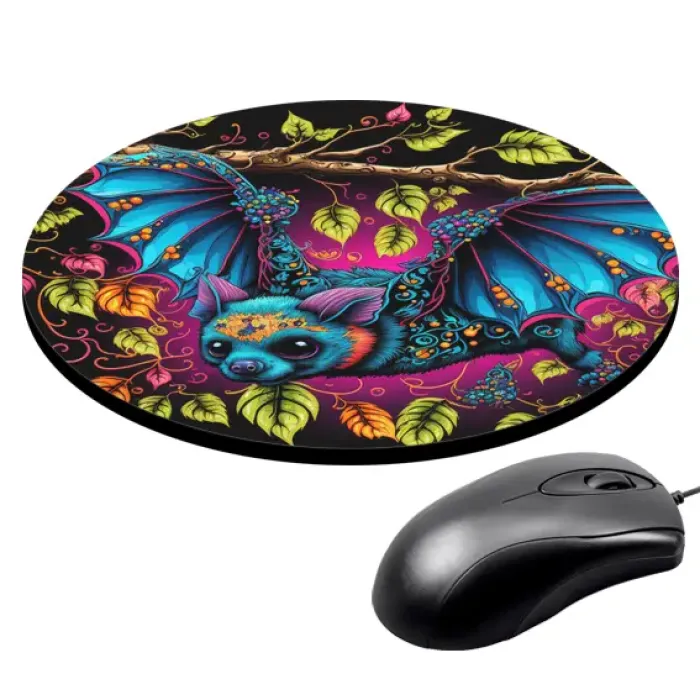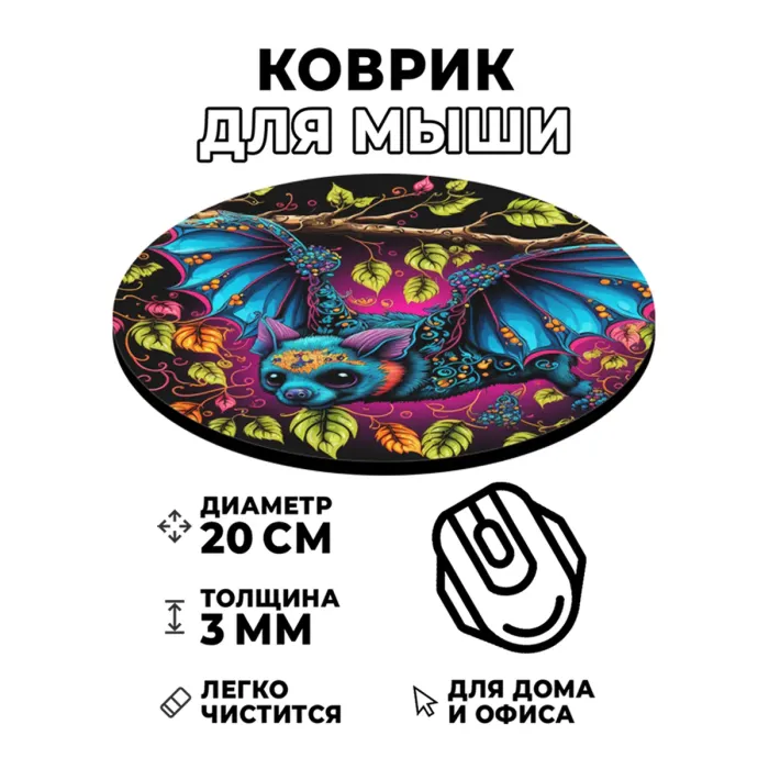 Коврик для компьютерной мыши с оригинальным изображением летучей мыши станет не только практичным аксессуаром, но и стильным элементом рабочего пространства. Диаметр коврика составляет 20 см, а толщина — 3 мм, что обеспечивает комфортное использование. Изображение отличается стойкостью и четкостью, придавая коврику яркий вид. Благодаря хорошему скольжению мышки работа за компьютером становится более приятной и эффективной. Такой коврик может стать отличным подарком или дополнением к интерьеру.