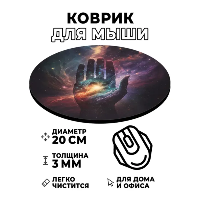 Коврик для мыши «Ладонь Творца» — это не просто аксессуар, а элемент вдохновения и креативности. С диаметром 20 см и толщиной 3 мм, он идеально подходит для работы или игр на компьютере.
