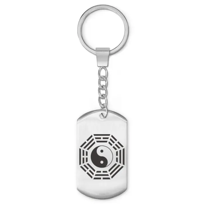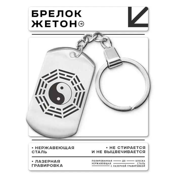 Брелок-жетон с символом Ба-Гуа (Инь-Ян). Изготовлен из нержавеющей стали с односторонней лазерной гравировкой.