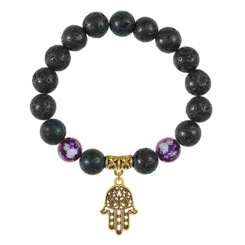 Браслет-амулет из натурального камня лава с подвеской хамса и фарфоровыми бусинами.