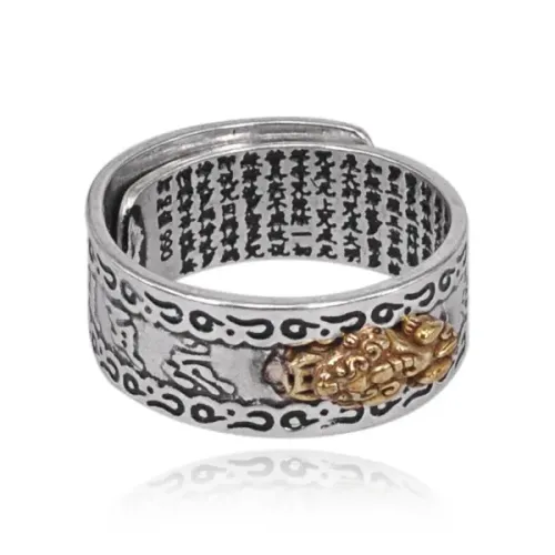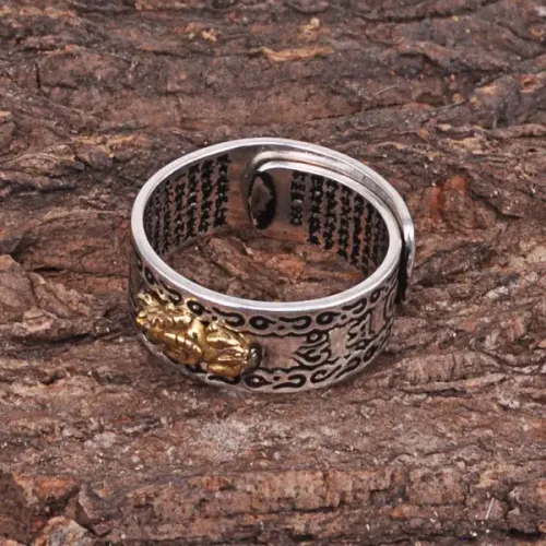 Безразмерное кольцо Пи Щу с монетой и мантрами — аксессуар из металла с покрытием под серебро и золото.