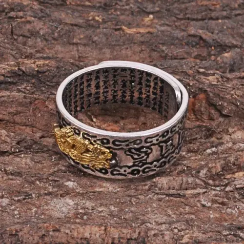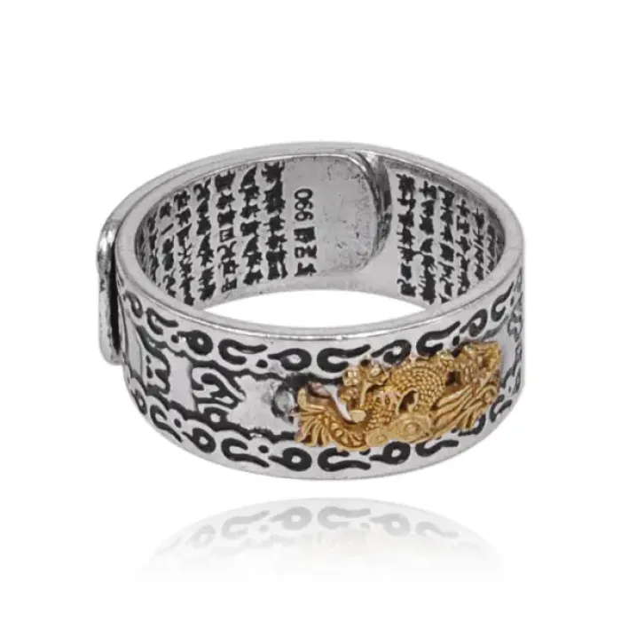Безразмерное кольцо с изображением дракона и мантрами. Изготовлено из металла с покрытием под серебро и золото.