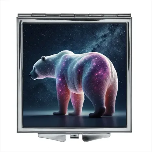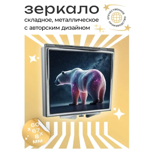 Складное зеркало квадратной формы с изображением белого медведя. Изготовлено из металла и стекла.